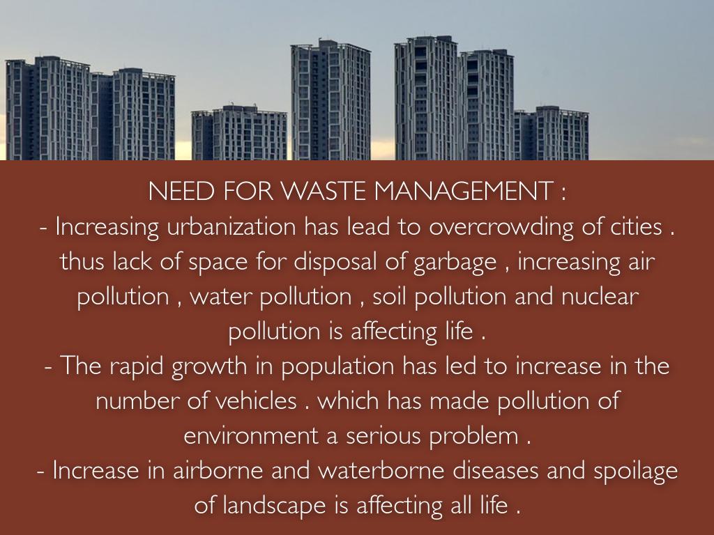 - Increasing urbanization has lead to overcrowding of cities . thus lack of space for disposal of garbage , increasing air pollution , water pollution , soil pollution and nuclear pollution is affecting life .