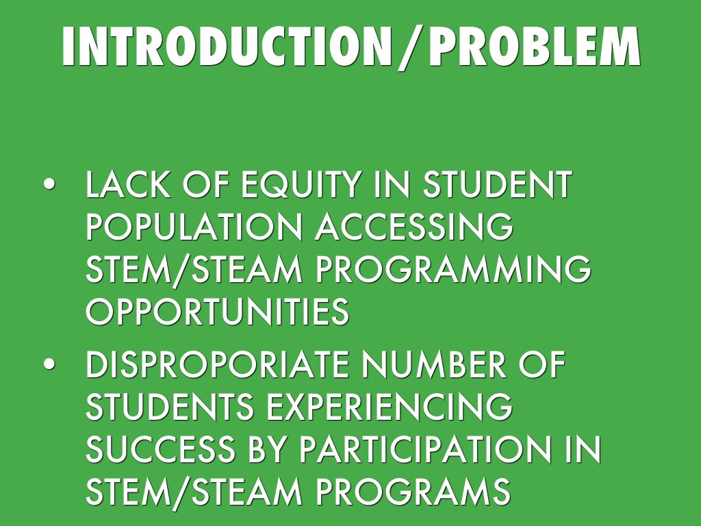 LACK OF EQUITY IN STUDENT POPULATION ACCESSING STEM/STEAM PROGRAMMING OPPORTUNITIES