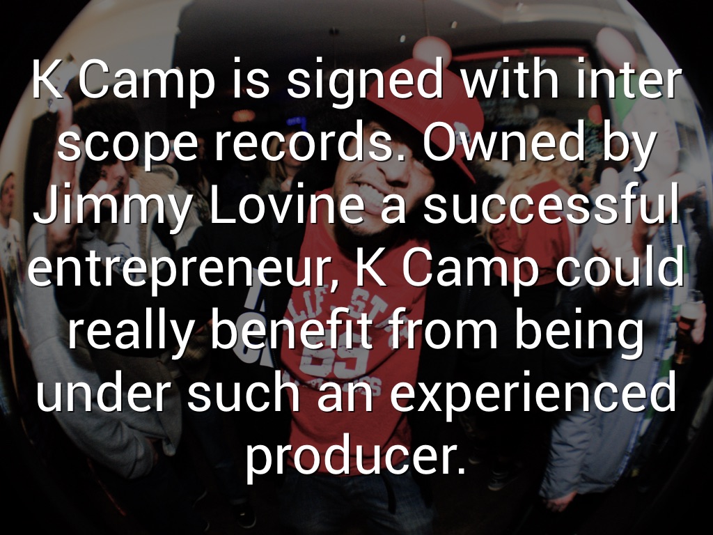 K Camp is signed with inter scope records. Owned by Jimmy Lovine a successful entrepreneur, K Camp could really benefit from being under such an experienced producer.