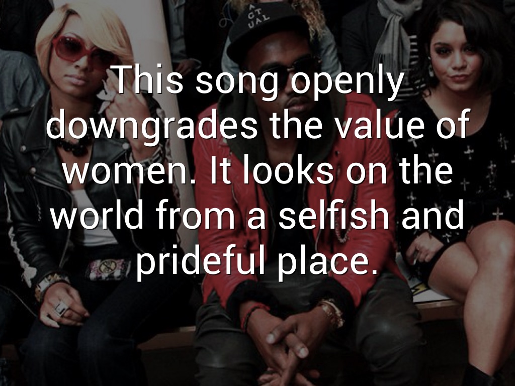 This song openly downgrades the value of women. It looks on the world from a selfish and prideful place.