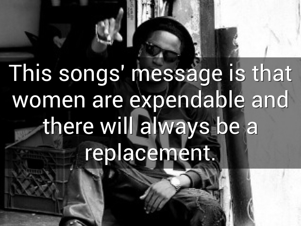 "Cut her off" portrays some of the ideas and beliefs that are wrong with our culture and society today. If the world looked like this song portrays it, then there would be a lot of messy relationships and hurt feelings. Mostly against women.