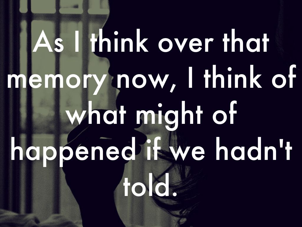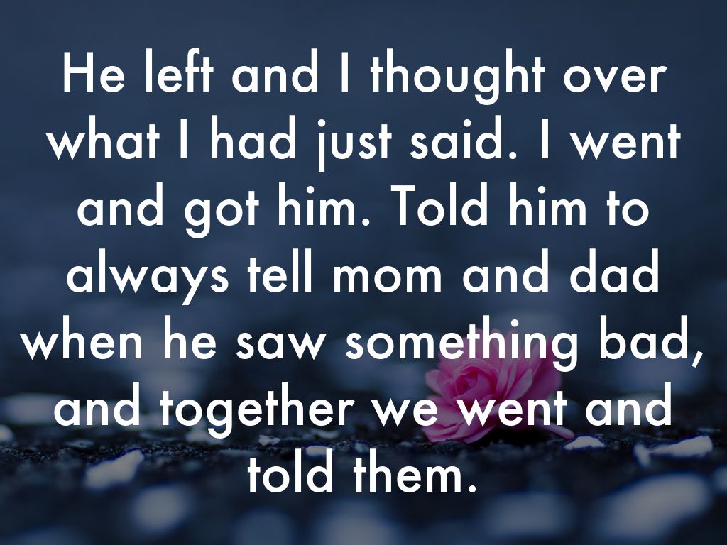 He left and I thought over what I had just said. I went and got him. Told him to always tell mom and dad when he saw something bad, and together we went and told them.