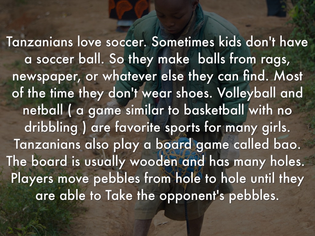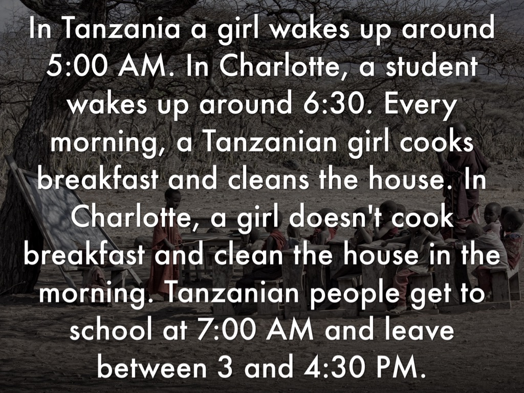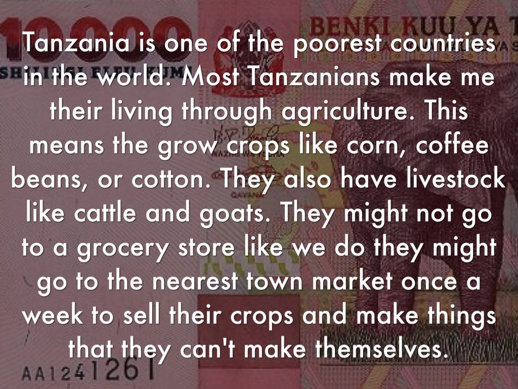 Tanzania is one of the poorest countries in the world. Most Tanzanians make me their living through agriculture. This means the grow crops like corn, coffee beans, or cotton. They also have livestock like cattle and goats. They might not go to a grocery store like we do they might go to the nearest town market once a week to sell their crops and make things that they can't make themselves.