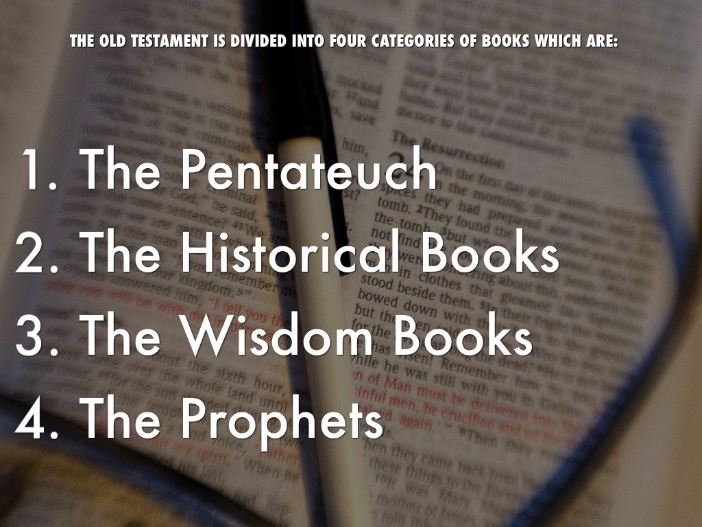 THE OLD TESTAMENT IS DIVIDED INTO FOUR CATEGORIES OF BOOKS WHICH ARE: