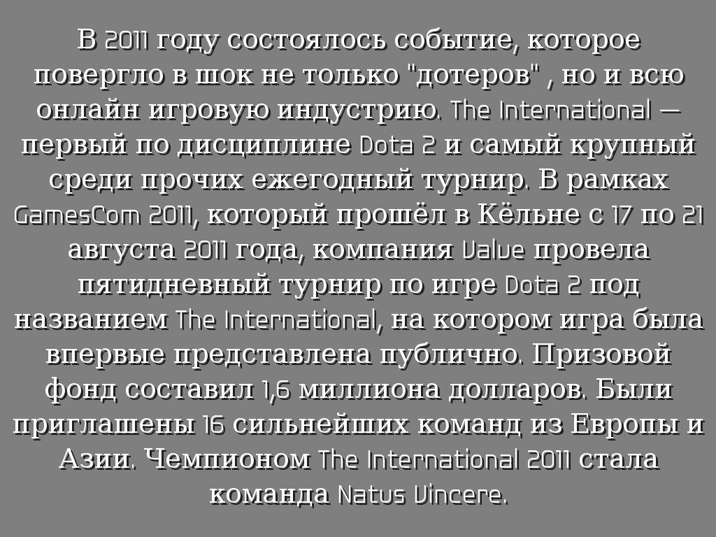 В 2011 году состоялось событие, которое повергло в шок не только "дотеров" , но и всю онлайн игровую индустрию. The International — первый по дисциплине Dota 2 и самый крупный среди прочих ежегодный турнир. В рамках GamesCom 2011, который прошёл в Кёльне с 17 по 21 августа 2011 года, компания Valve провела пятидневный турнир по игре Dota 2 под названием The International, на котором игра была впервые представлена публично. Призовой фонд составил 1,6 миллиона долларов. Были приглашены 16 сильнейших команд из Европы и Азии. Чемпионом The International 2011 стала команда Natus Vincere.