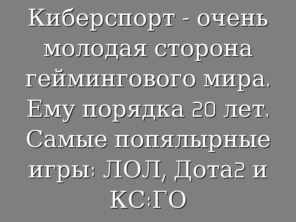 Киберспорт - очень молодая сторона геймингового мира. Ему порядка 20 лет. Самые попялырные игры: ЛОЛ, Дота2 и КС:ГО