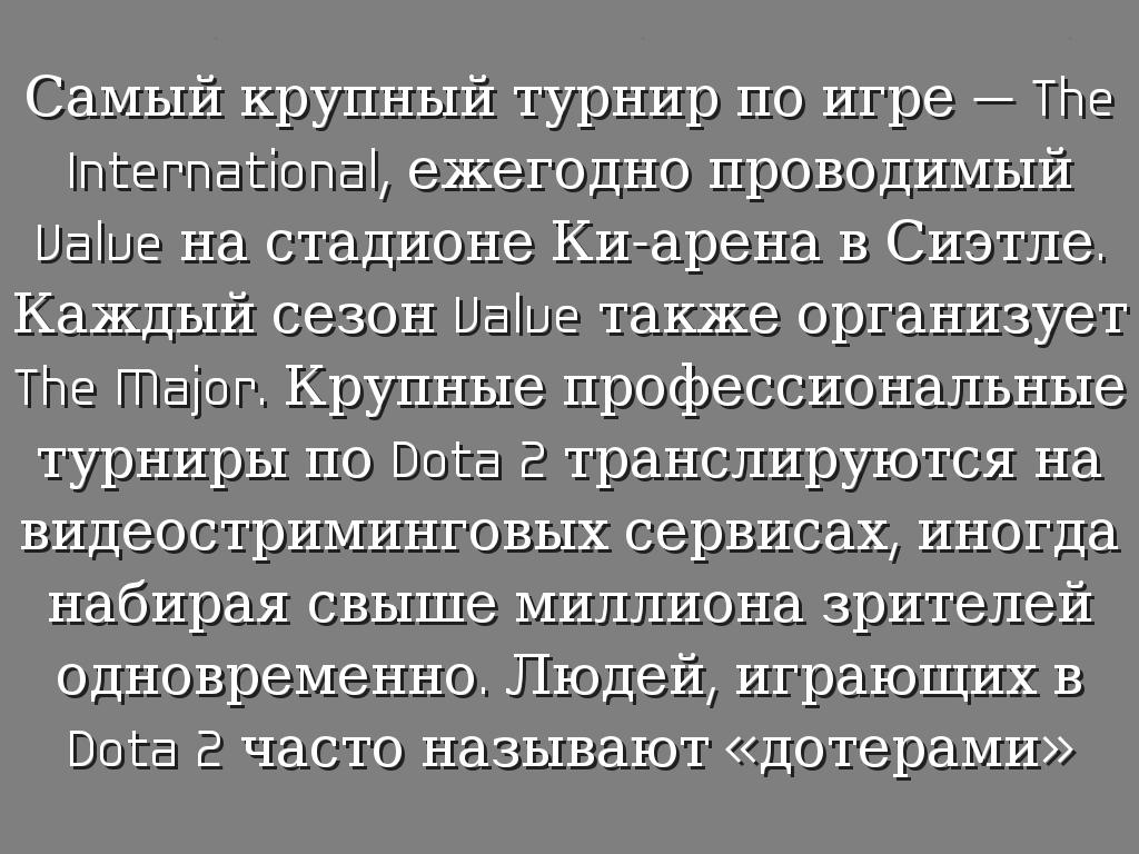 Самый крупный турнир по игре — The International, ежегодно проводимый Valve на стадионе Ки-арена в Сиэтле. Каждый сезон Valve также организует The Major. Крупные профессиональные турниры по Dota 2 транслируются на видеостриминговых сервисах, иногда набирая свыше миллиона зрителей одновременно. Людей, играющих в Dota 2 часто называют «дотерами»