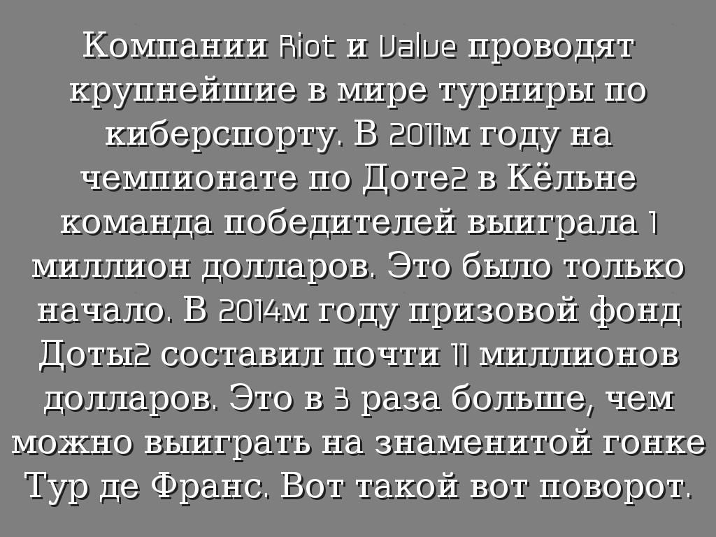 Компании Riot и Valve проводят крупнейшие в мире турниры по киберспорту. В 2011м году на чемпионате по Доте2 в Кёльне команда победителей выиграла 1 миллион долларов. Это было только начало. В 2014м году призовой фонд Доты2 составил почти 11 миллионов долларов. Это в 3 раза больше, чем можно выиграть на знаменитой гонке Тур де Франс. Вот такой вот поворот.