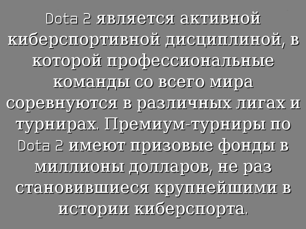 Dota 2 является активной киберспортивной дисциплиной, в которой профессиональные команды со всего мира соревнуются в различных лигах и турнирах. Премиум-турниры по Dota 2 имеют призовые фонды в миллионы долларов, не раз становившиеся крупнейшими в истории киберспорта.