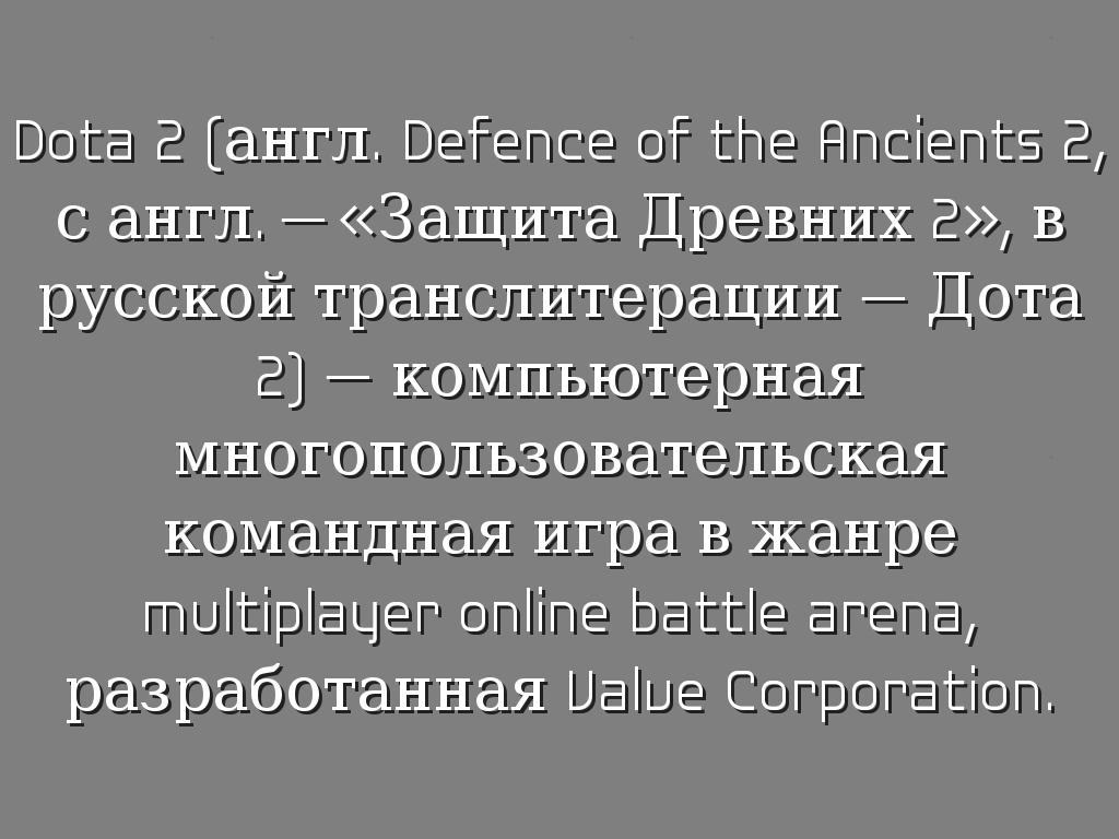 Dota 2 (англ. Defence of the Ancients 2, с англ. — «Защита Древних 2», в русской транслитерации — Дота 2) — компьютерная многопользовательская командная игра в жанре multiplayer online battle arena, разработанная Valve Corporation.