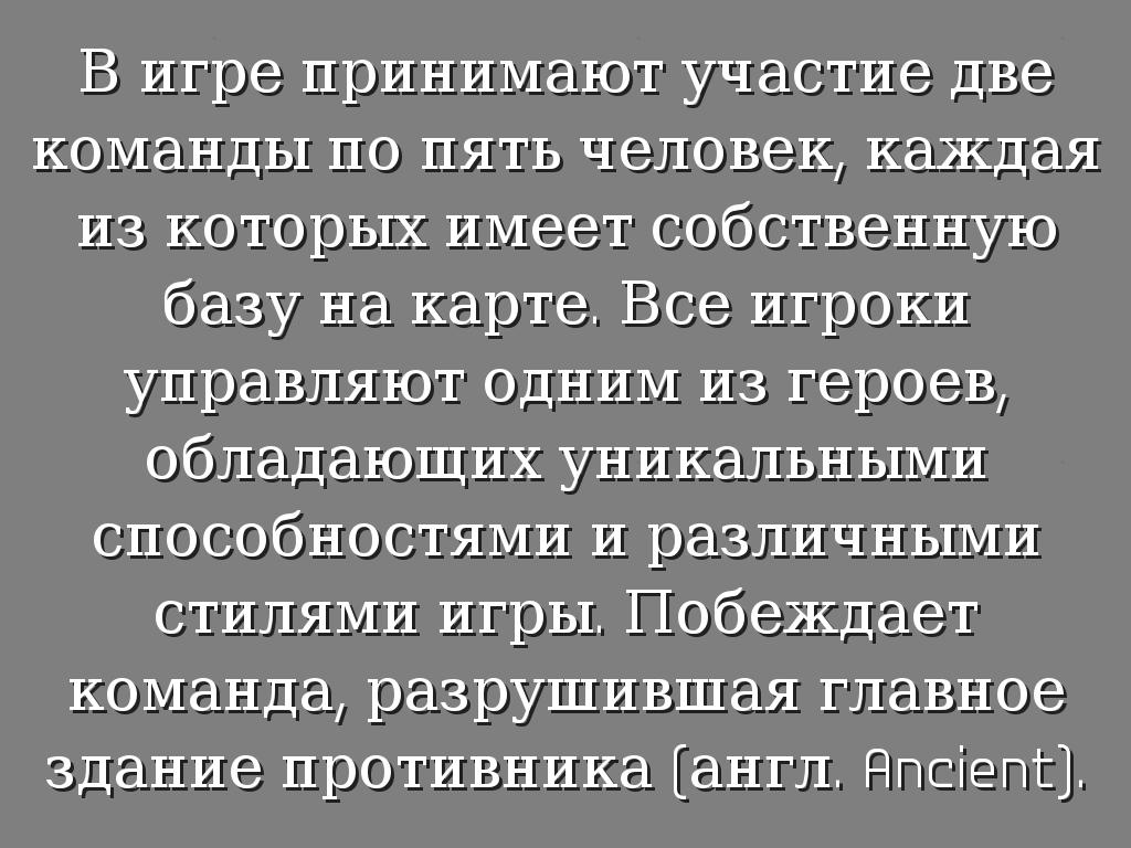В игре принимают участие две команды по пять человек, каждая из которых имеет собственную базу на карте. Все игроки управляют одним из героев, обладающих уникальными способностями и различными стилями игры. Побеждает команда, разрушившая главное здание противника (англ. Ancient).