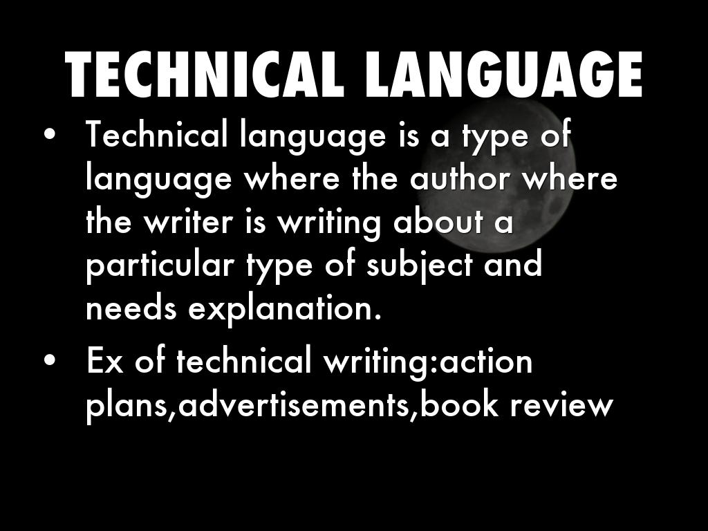 Technical language is a type of language where the author where the writer is writing about a particular type of subject and needs explanation.