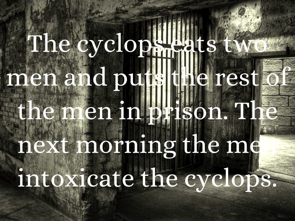 The cyclops eats two men and puts the rest of the men in prison. The next morning the men intoxicate the cyclops.