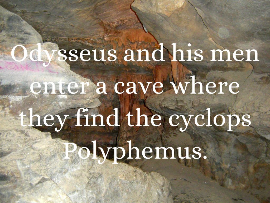 Odysseus and his men enter a cave where they find the cyclops Polyphemus.