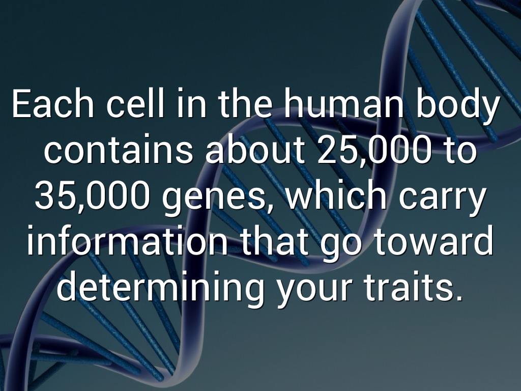 Each cell in the human body contains about 25,000 to 35,000 genes, which carry information that go toward determining your traits.