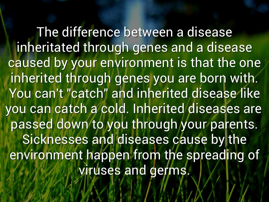 The difference between a disease inheritated through genes and a disease caused by your environment is that the one inherited through genes you are born with. You can't "catch" and inherited disease like you can catch a cold. Inherited diseases are passed down to you through your parents. Sicknesses and diseases cause by the environment happen from the spreading of viruses and germs.