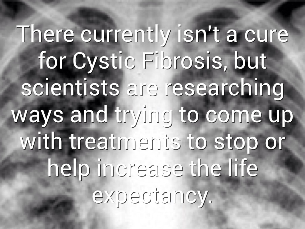 There currently isn't a cure for Cystic Fibrosis, but scientists are researching ways and trying to come up with treatments to stop or help increase the life expectancy.
