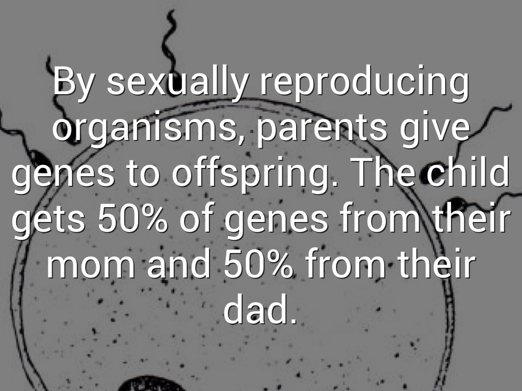 By sexually reproducing organisms, parents give genes to offspring. The child gets 50% of genes from their mom and 50% from their dad.