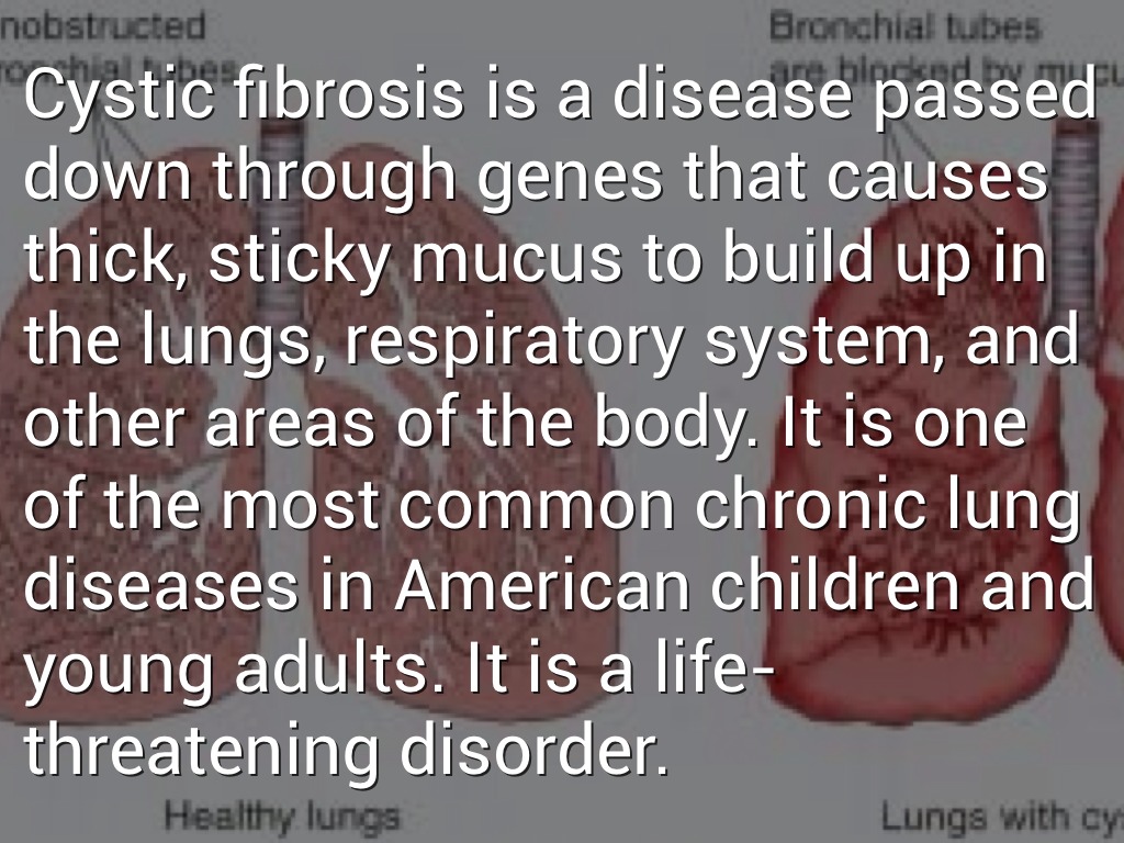 Cystic fibrosis is a disease passed down through genes that causes thick, sticky mucus to build up in the lungs, respiratory system, and other areas of the body. It is one of the most common chronic lung diseases in American children and young adults. It is a life-threatening disorder.