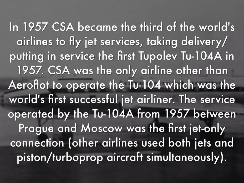 In 1957 CSA became the third of the world's airlines to fly jet services, taking delivery/putting in service the first Tupolev Tu-104A in 1957. CSA was the only airline other than Aeroflot to operate the Tu-104 which was the world's first successful jet airliner. The service operated by the Tu-104A from 1957 between Prague and Moscow was the first jet-only connection (other airlines used both jets and piston/turboprop aircraft simultaneously).