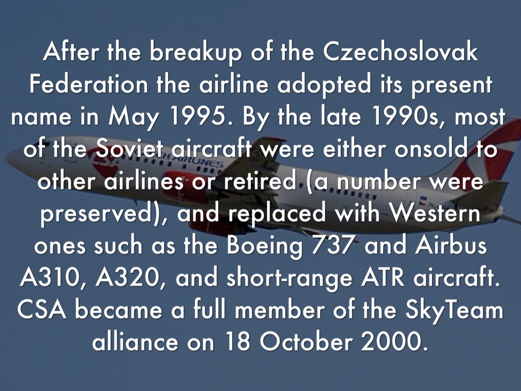 After the breakup of the Czechoslovak Federation the airline adopted its present name in May 1995. By the late 1990s, most of the Soviet aircraft were either onsold to other airlines or retired (a number were preserved), and replaced with Western ones such as the Boeing 737 and Airbus A310, A320, and short-range ATR aircraft. CSA became a full member of the SkyTeam alliance on 18 October 2000.