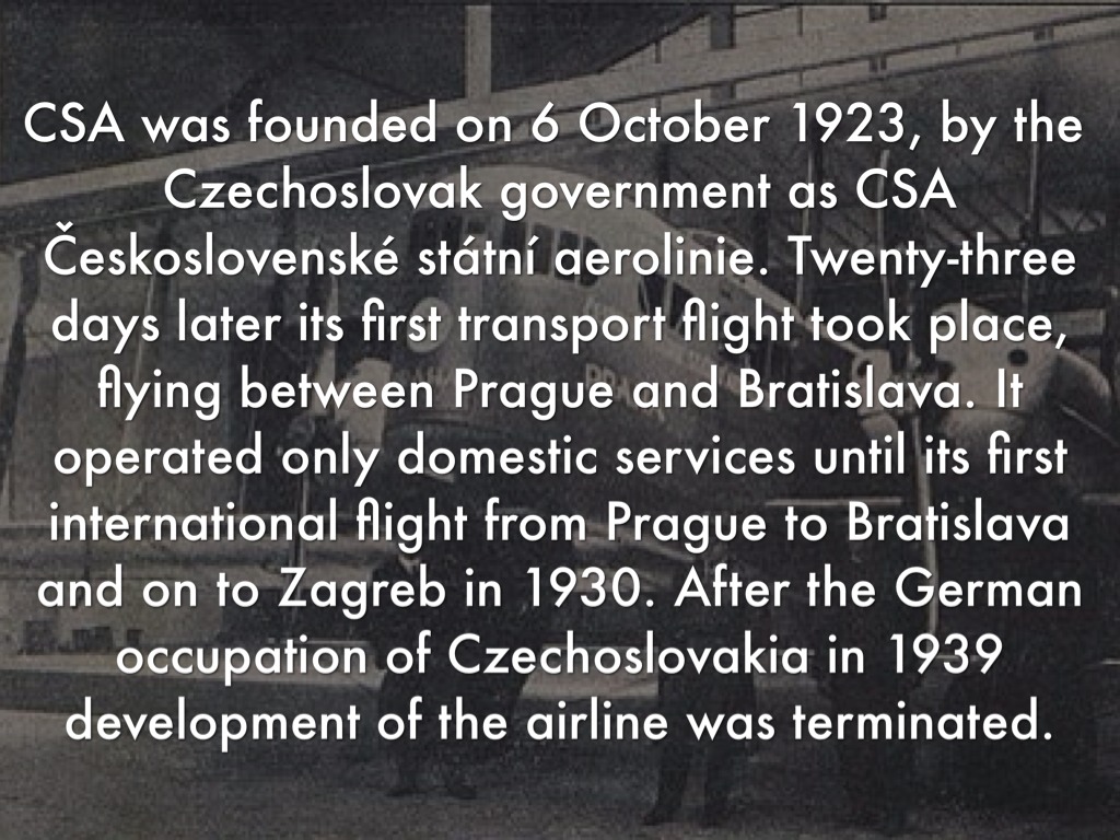 CSA was founded on 6 October 1923, by the Czechoslovak government as CSA Československé státní aerolinie. Twenty-three days later its first transport flight took place, flying between Prague and Bratislava. It operated only domestic services until its first international flight from Prague to Bratislava and on to Zagreb in 1930. After the German occupation of Czechoslovakia in 1939 development of the airline was terminated.
