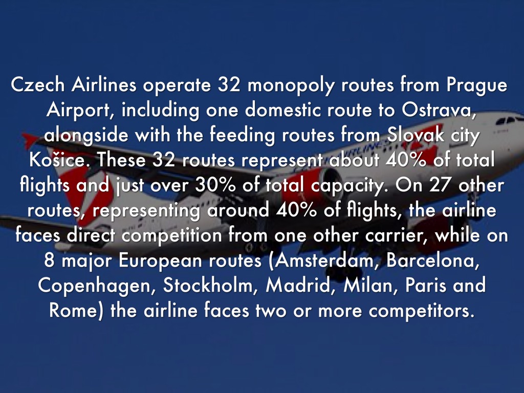 Czech Airlines operate 32 monopoly routes from Prague Airport, including one domestic route to Ostrava, alongside with the feeding routes from Slovak city Košice. These 32 routes represent about 40% of total flights and just over 30% of total capacity. On 27 other routes, representing around 40% of flights, the airline faces direct competition from one other carrier, while on 8 major European routes (Amsterdam, Barcelona, Copenhagen, Stockholm, Madrid, Milan, Paris and Rome) the airline faces two or more competitors.
