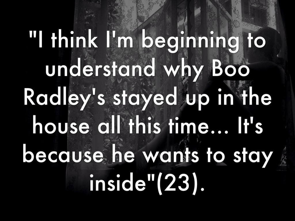 "I think I'm beginning to understand why Boo Radley's stayed up in the house all this time... It's because he wants to stay inside"(23).