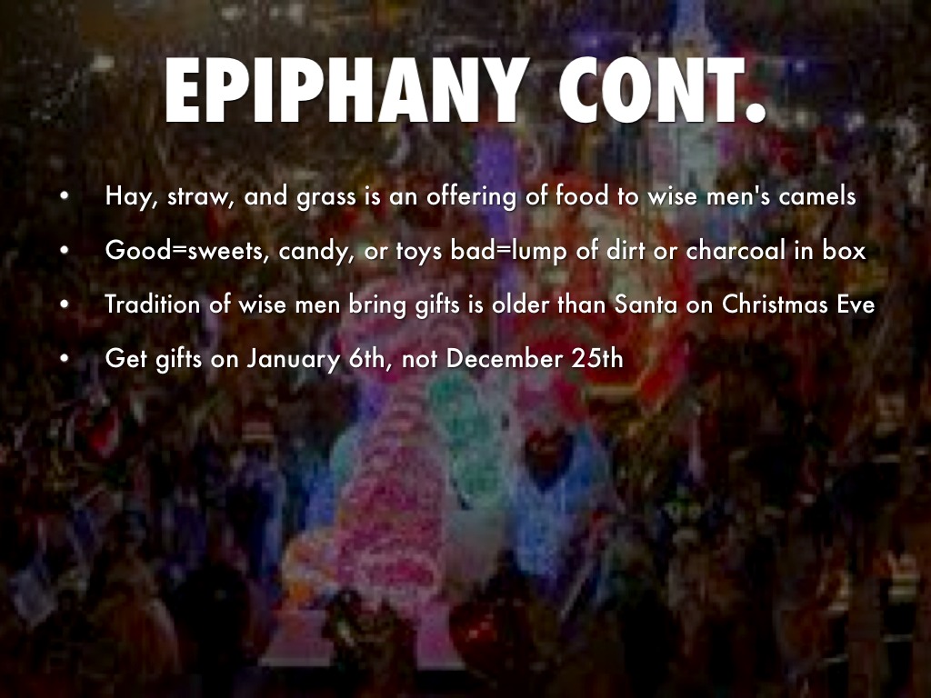 celebrates the Three Wise Men's visit to see the newborn Christ by exchanging gifts.