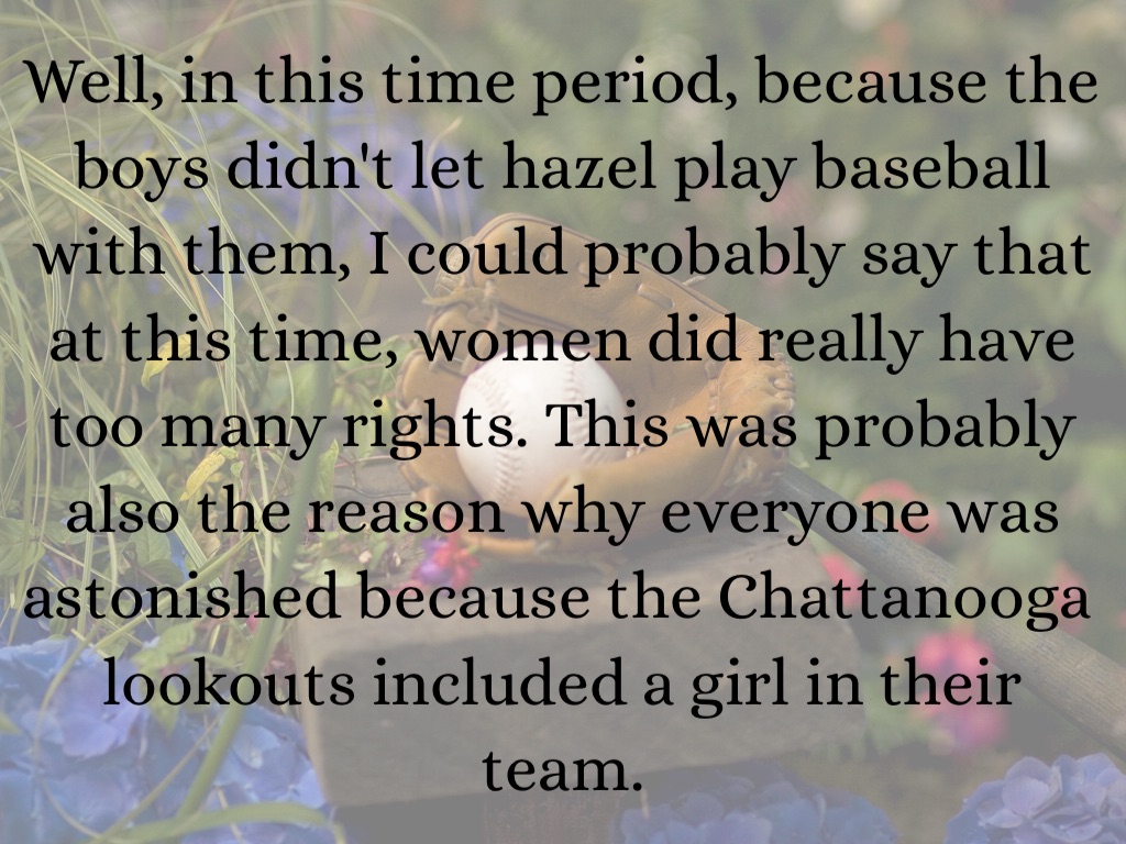 Well, in this time period, because the boys didn't let hazel play baseball with them, I could probably say that at this time, women did really have too many rights. This was probably also the reason why everyone was astonished because the Chattanooga lookouts included a girl in their team.