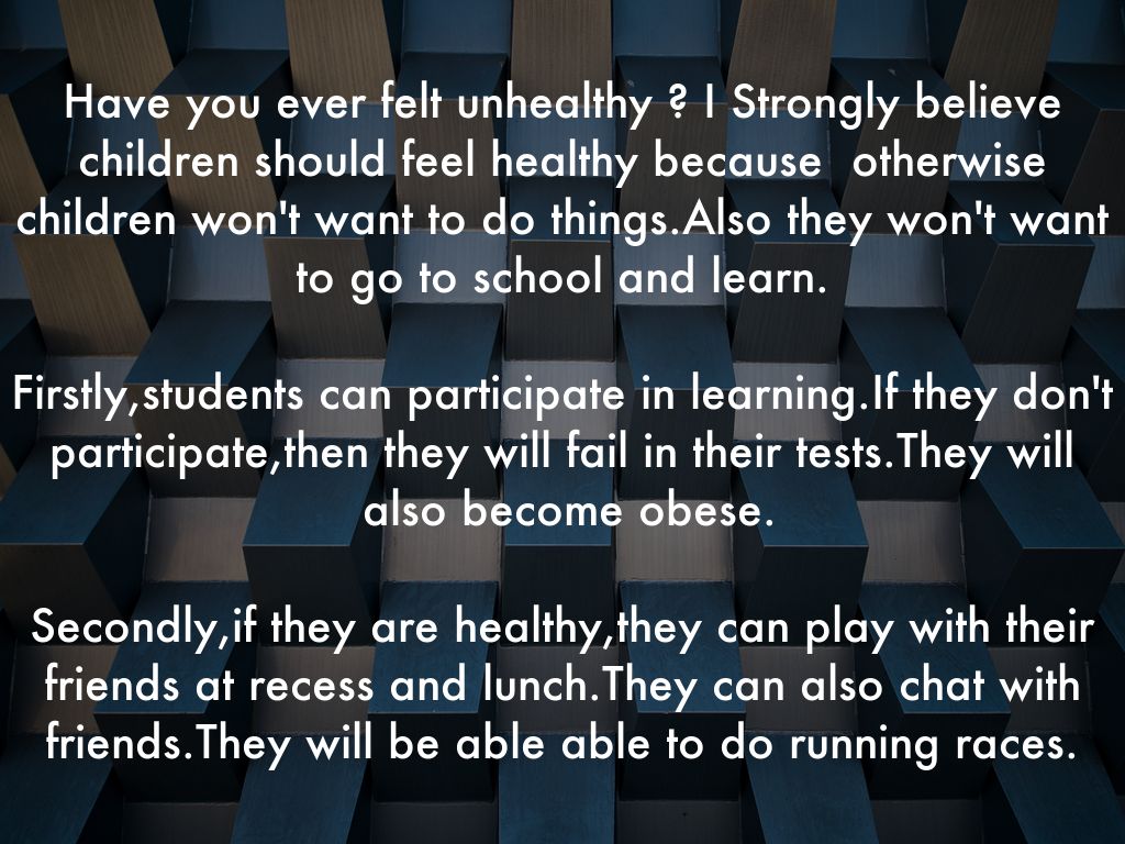 Have you ever felt unhealthy ? I Strongly believe children should feel healthy because otherwise children won't want to do things.Also they won't want to go to school and learn.