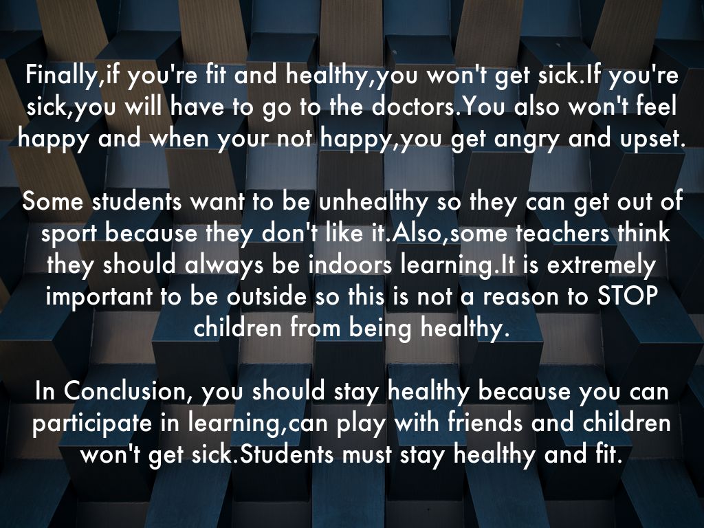 In Conclusion, you should stay healthy because you can participate in learning,can play with friends and children won't get sick.Students must stay healthy and fit.