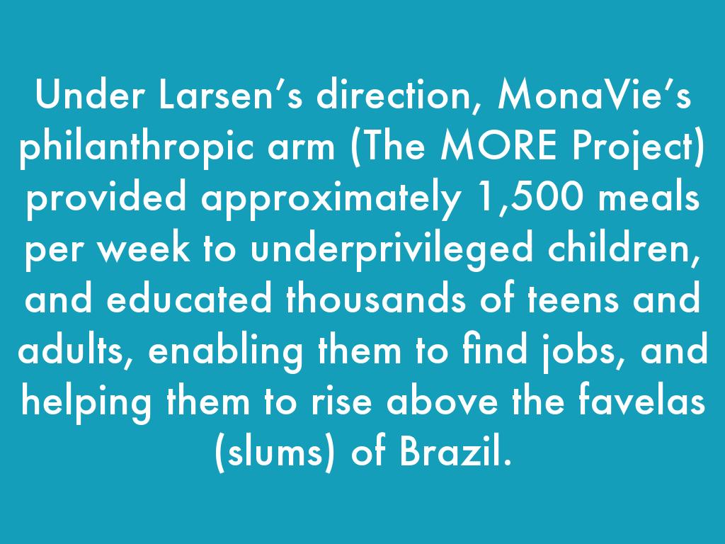 Under Larsen’s direction, MonaVie’s philanthropic arm (The MORE Project) provided approximately 1,500 meals per week to underprivileged children, and educated thousands of teens and adults, enabling them to find jobs, and helping them to rise above the favelas (slums) of Brazil.