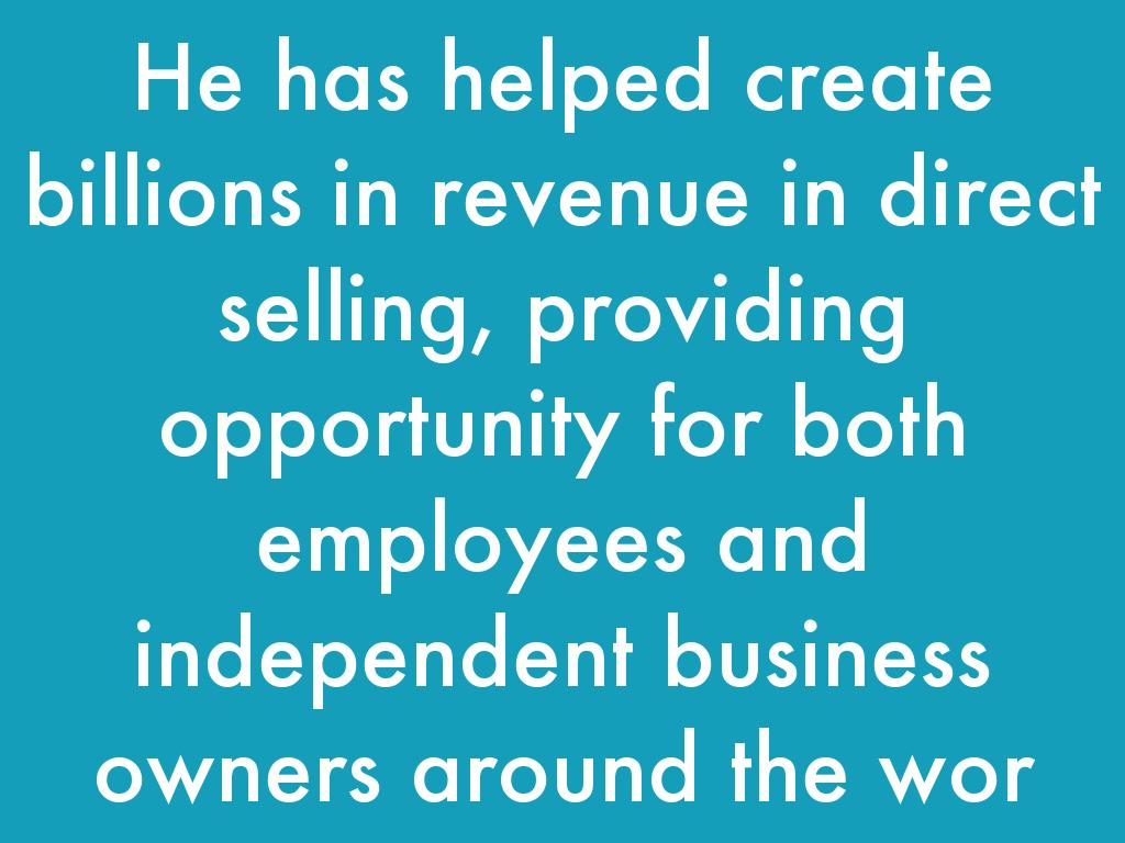 He has helped create billions in revenue in direct selling, providing opportunity for both employees and independent business owners around the wor