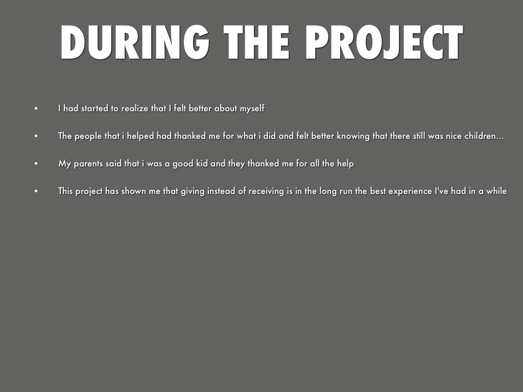 - This project has shown me that giving instead of receiving is in the long run the best experience I've had in a while