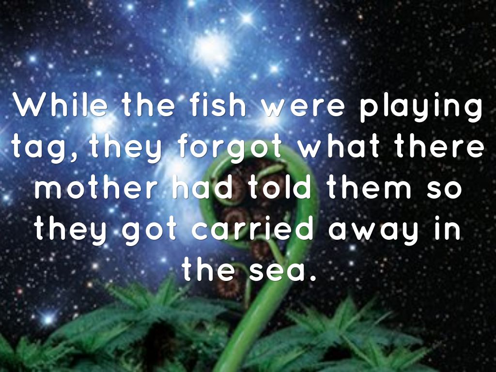 While the fish were playing tag, they forgot what there mother had told them so they got carried away in the sea.