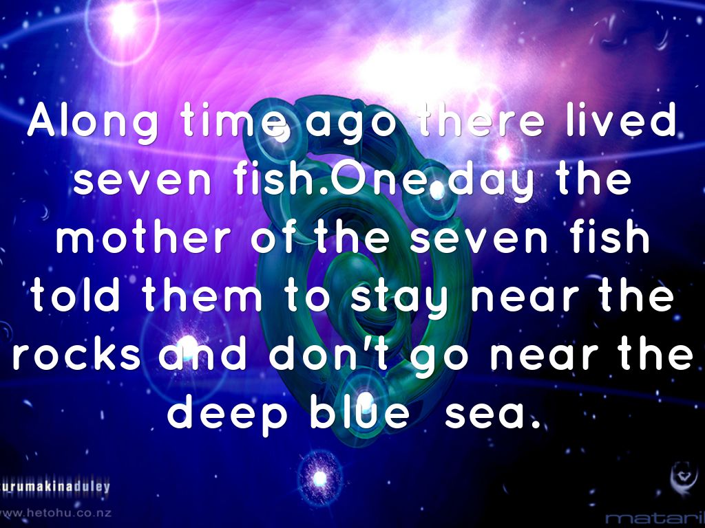 Along time ago there lived seven fish.One day the mother of the seven fish told them to stay near the rocks and don't go near the deep blue sea.