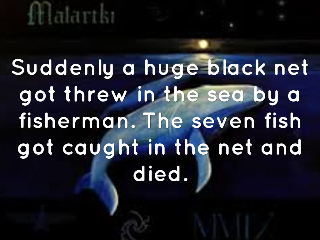 Suddenly a huge black net got threw in the sea by a fisherman. The seven fish got caught in the net and died.