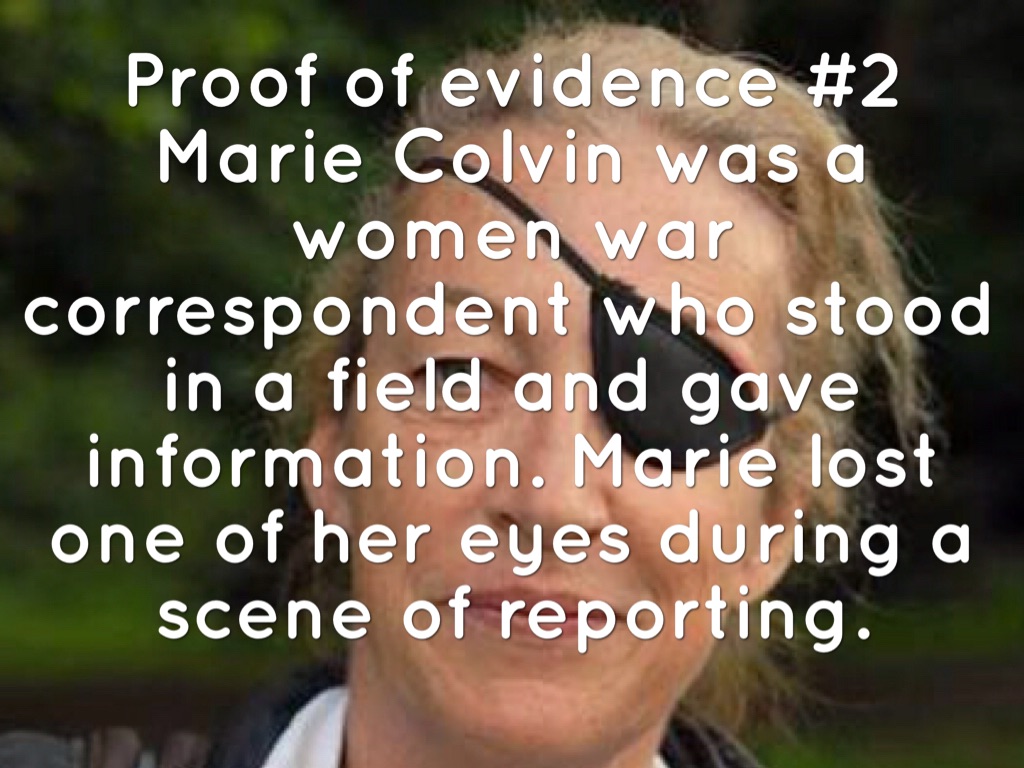 Marie Colvin was a women war correspondent who stood in a field and gave information. Marie lost one of her eyes during a scene of reporting.
