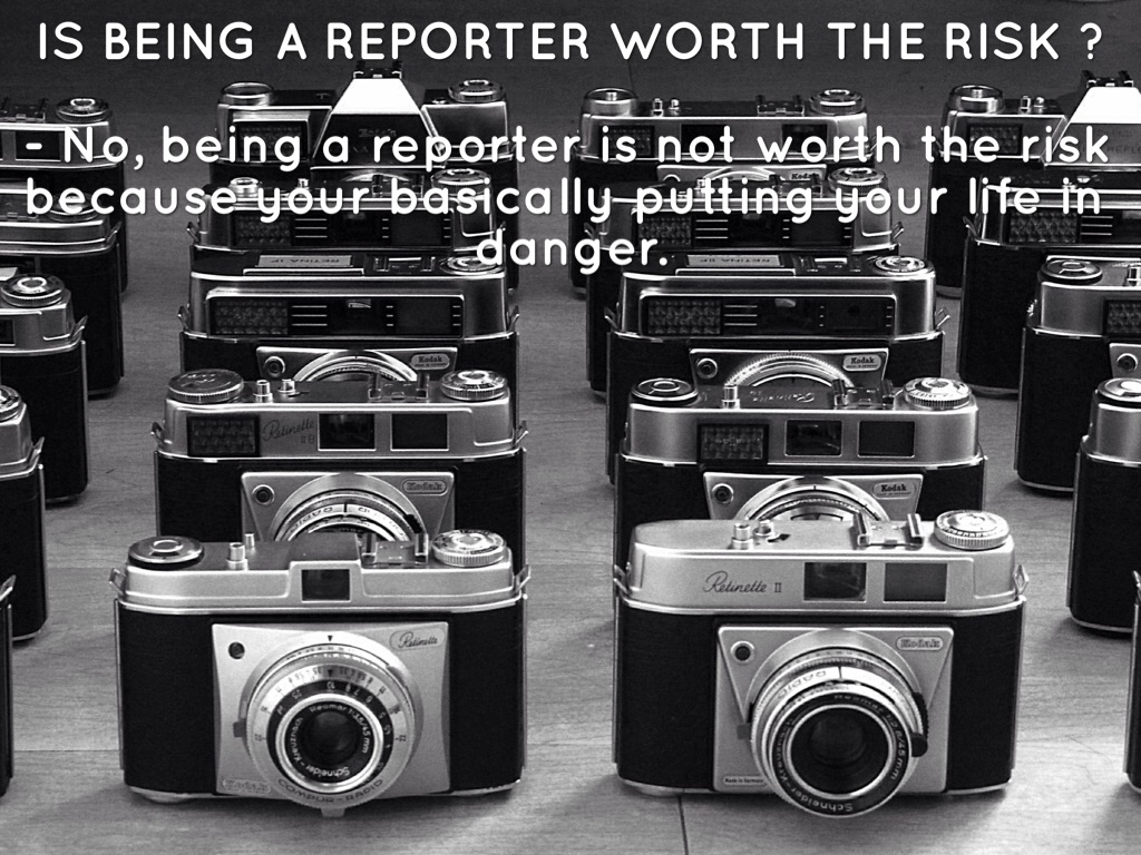 - No, being a reporter is not worth the risk because your basically putting your life in danger.