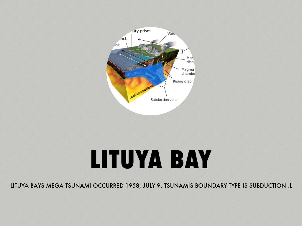 LITUYA BAYS MEGA TSUNAMI OCCURRED 1958, JULY 9. TSUNAMIS BOUNDARY TYPE IS SUBDUCTION .L