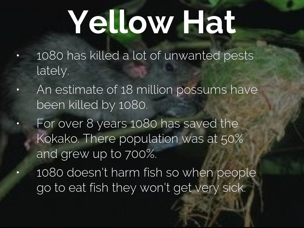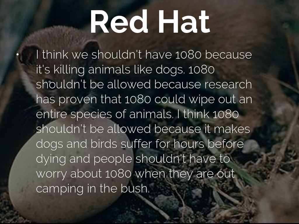 I think we shouldn't have 1080 because it's killing animals like dogs. 1080 shouldn't be allowed because research has proven that 1080 could wipe out an entire species of animals. I think 1080 shouldn't be allowed because it makes dogs and birds suffer for hours before dying and people shouldn't have to worry about 1080 when they are out camping in the bush.