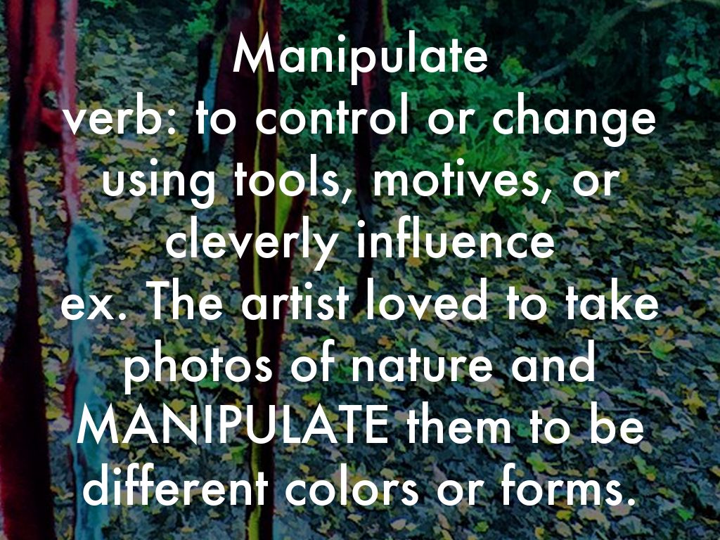 Manipulate verb: to control or change using tools, motives, or cleverly influence ex. The artist loved to take photos of nature and MANIPULATE them to be different colors or forms.