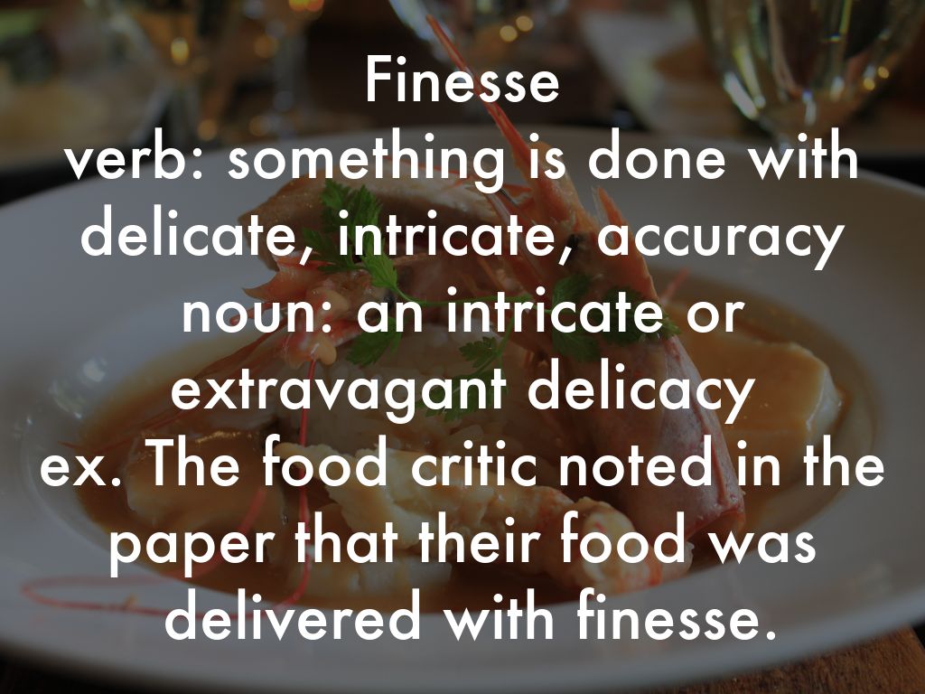 Finesse verb: something is done with delicate, intricate, accuracy noun: an intricate or extravagant delicacy ex. The food critic noted in the paper that their food was delivered with finesse.