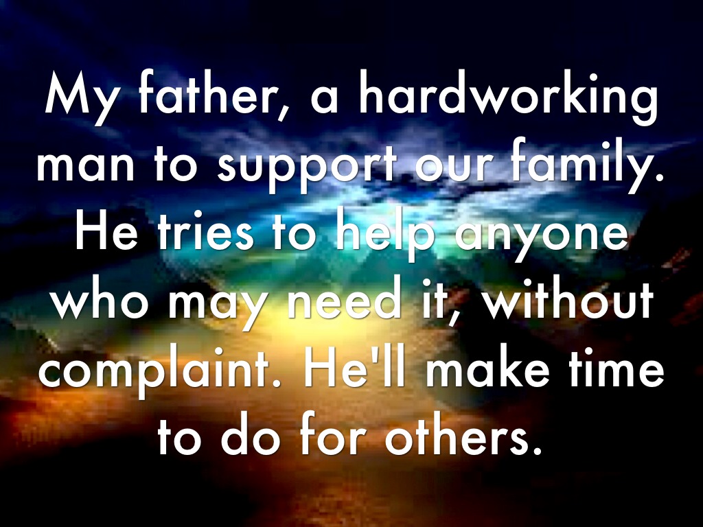 My father, a hardworking man to support our family. He tries to help anyone who may need it, without complaint. He'll make time to do for others.