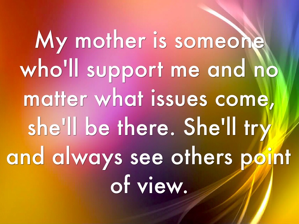 My mother is someone who'll support me and no matter what issues come, she'll be there. She'll try and always see others point of view.