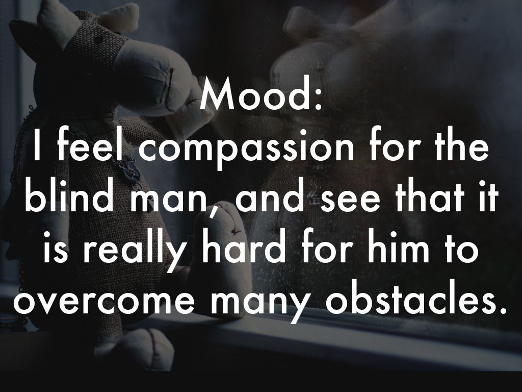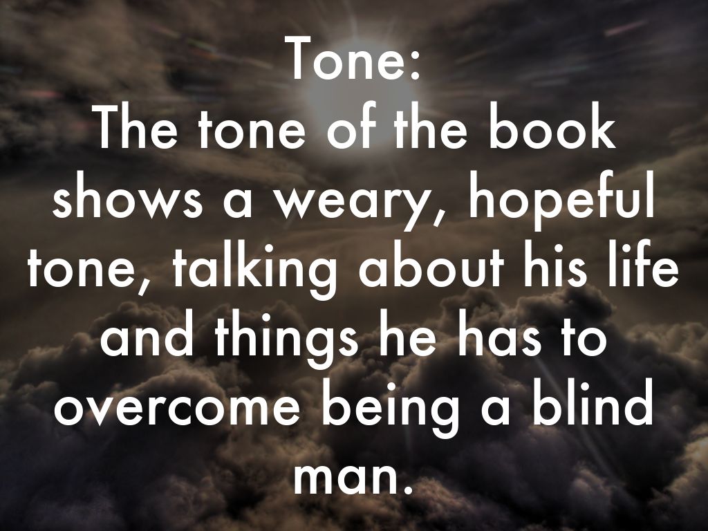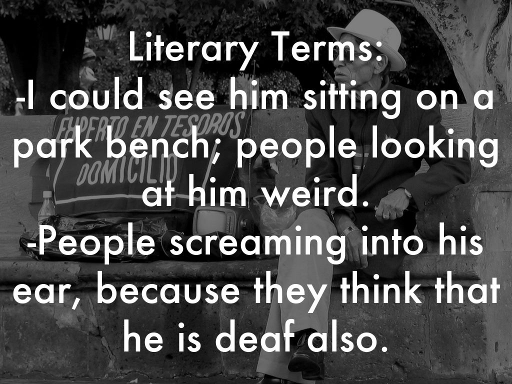 Literary Terms: -I could see him sitting on a park bench; people looking at him weird. -People screaming into his ear, because they think that he is deaf also.