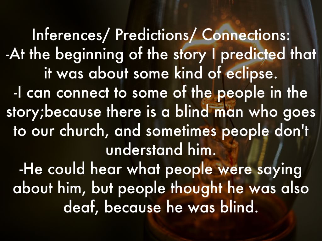 Inferences/ Predictions/ Connections: -At the beginning of the story I predicted that it was about some kind of eclipse. -I can connect to some of the people in the story;because there is a blind man who goes to our church, and sometimes people don't understand him. -He could hear what people were saying about him, but people thought he was also deaf, because he was blind.