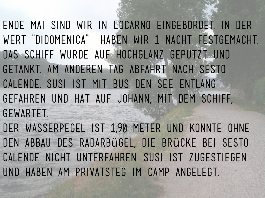 Ende Mai sind wir in Locarno eingebordet. In der Wert "diDomenico" haben wir 1 Nacht festgemacht. Das Schiff wurde auf Hochglanz geputzt und getankt. Am anderen Tag Abfahrt nach Sesto Calende. Susi ist mit Bus den See entlang gefahren und hat auf Johann, mit dem Schiff, gewartet. Der Wasserpegel ist 1,90 Meter und konnte ohne den Abbau des Radarbügel, die Brücke bei Sesto Calende nicht unterfahren. Susi ist zugestiegen und haben am Privatsteg im Camp angelegt.