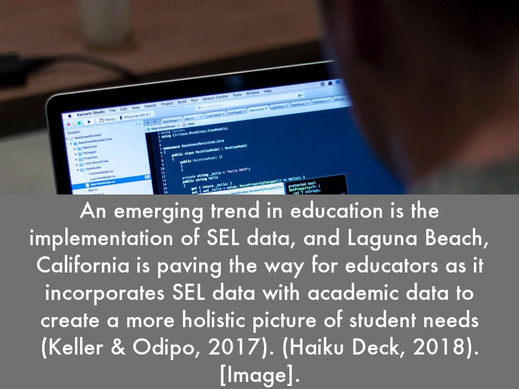 An emerging trend in education is the implementation of SEL data, and Laguna Beach, California is paving the way for educators as it incorporates SEL data with academic data to create a more holistic picture of student needs (Keller & Odipo, 2017). (Haiku Deck, 2018). [Image].